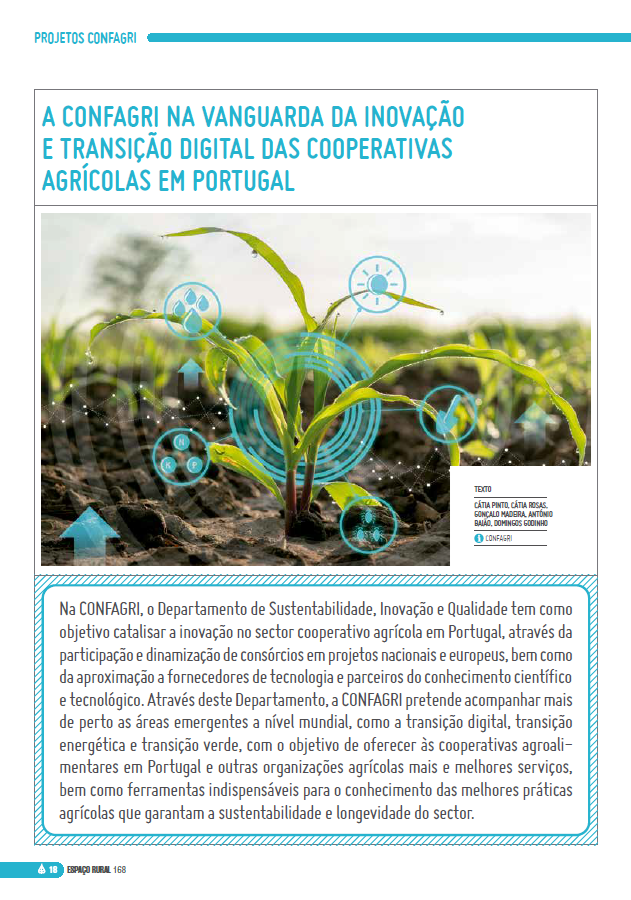 No artigo “A CONFAGRI na Vanguarda da Inovação e Transição Digital das Cooperativas Agrícolas em Portugal“, publicado na Revista Espaço Rural n.º 168, a equipa que integra o nosso Departamento de Sustentabilidade, Inovação e Qualidade faz um balanço destes últimos anos, destacando a participação em projetos tais como: