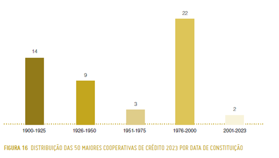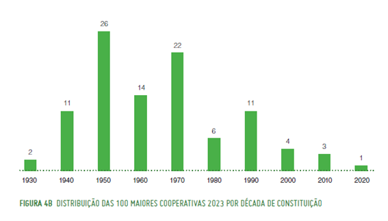 Quanto à longevidade, 22 das 50 cooperativas conta com mais de 75 anos de atividade e 14 das quais são já centenárias, sendo que a mais antiga soma 112 anos e a mais recente 13 anos.