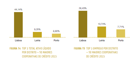 Em 2023, o Total do Ativo Líquido destas 50 cooperativas foi de 33,4 mil milhões, mais 647 milhões de euros que em 2022. As mesmas cooperativas somaram 3.556 trabalhadores, verificando-se um aumento de 4% face ao ano anterior. Importa referir o peso da Caixa Central de Crédito Agrícola Mútuo, pois representa 44% do Ativo Líquido Total e 26% do número de trabalhadores, o que confere a liderança ao distrito de Lisboa nesses dois indicadores.